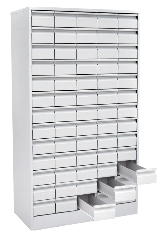 Металлический картотечный шкаф для библиотечных карточек оборудован 65 небольшими выдвижными ящиками на роликовых направляющих. Внутренние размеры ящиков — 85x130x400 мм.