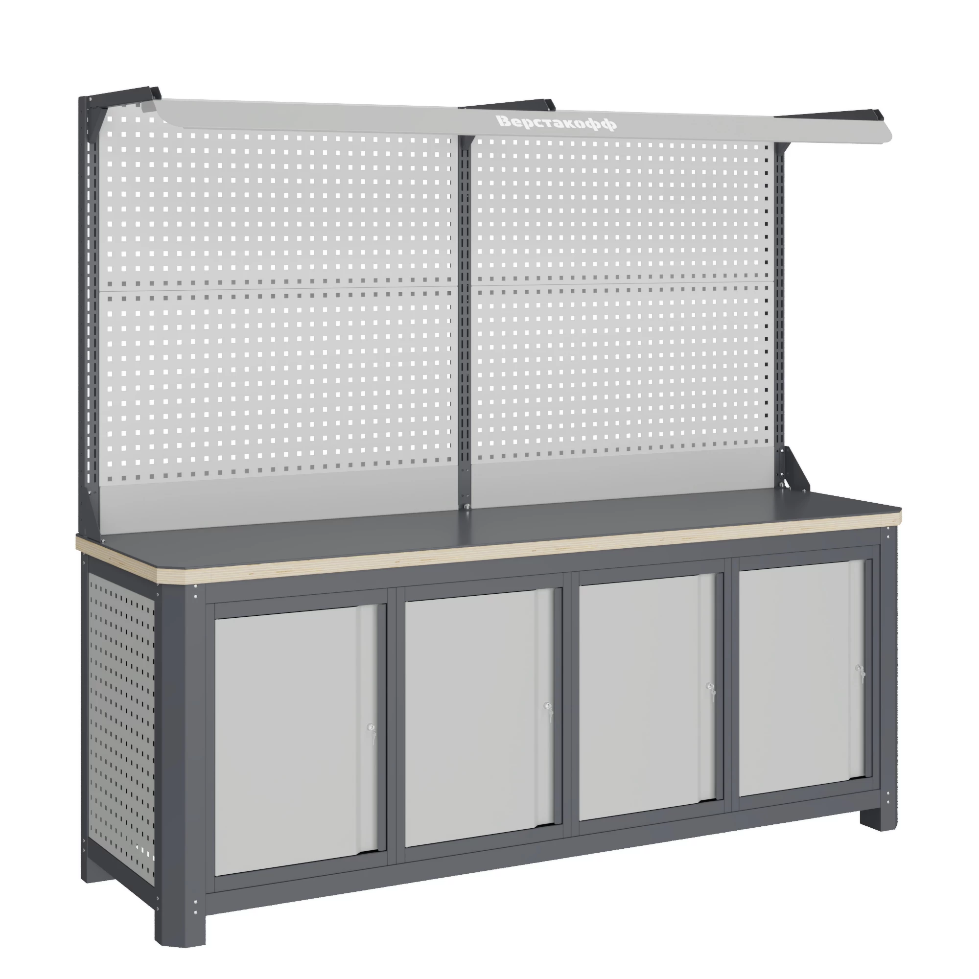 По желанию верстак дополнительно оборудуется полочками, навесными шкафами, держателями, крючками, блоками розеток и другими приспособлениями для комфортной организации рабочего места.