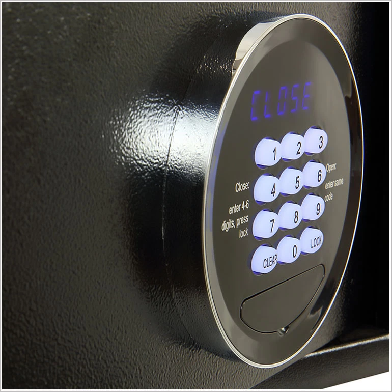 Электронный замок оснащен системой звукового и светового оповещения и запирается изменяемым цифровым кодом. У замка есть возможность менять режим пользования: домашний или отельный (при котором устанавливается конкретное время использования сейфа, по истечении времени сейфом больше нельзя воспользоваться). Всем желающим, мы предлагаем воспользоваться мастер кодом и программатором (к каждой партии вы можете отдельно заказать устройство для программирования сейфов).