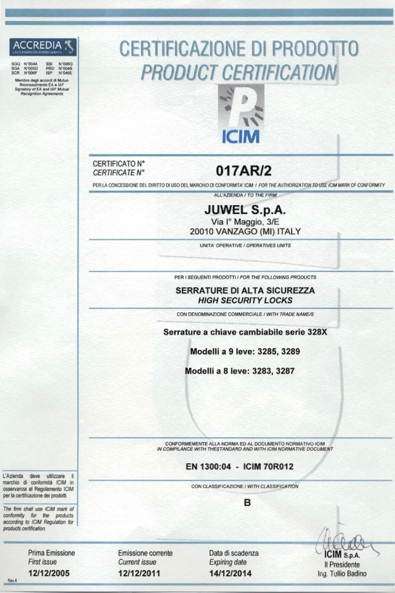 Сейф-тайник Juwel 4754 запирается итальянским кодовым замком Sercas, сертифицированным по строгому европейскому стандарту EN 1300 (class B). Замок с тремя наборными кругами кодируется сочетанием трёх чисел, что означает 1 440 000 вероятных комбинаций. Код меняется при помощи ключа. При открытой двери возможно сбросить код на «нулевой».
